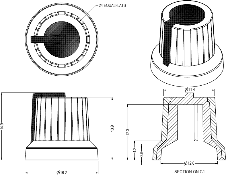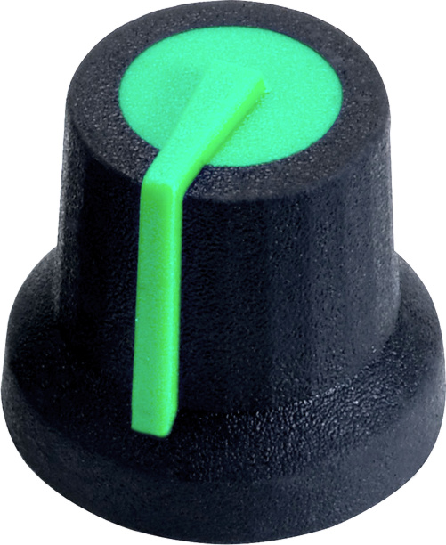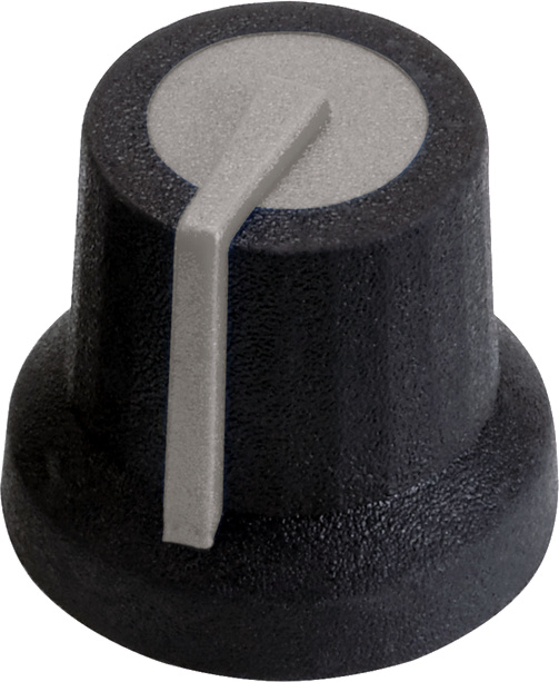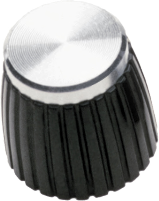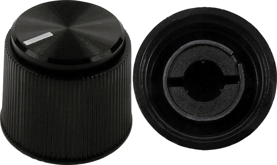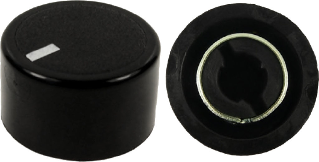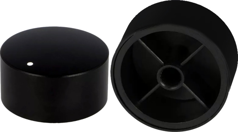 K1C Practical low cost knob, often used in outdoors equipment. Plain black or satin disc version. Marker dot on skirt.