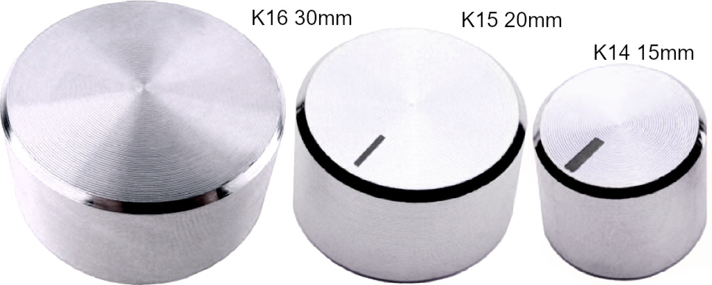 KMR12 to KMR35 Matt Matte black or silver, aluminium-clad aluminum-clad plastic with domed top and smooth, powder-coated finish. 12 to 35 mm diameter. Push fit 18T 6 mm splined shaft. Supplied in plastic moulded molded trays. Other colours colors available, subject to viable quantities.