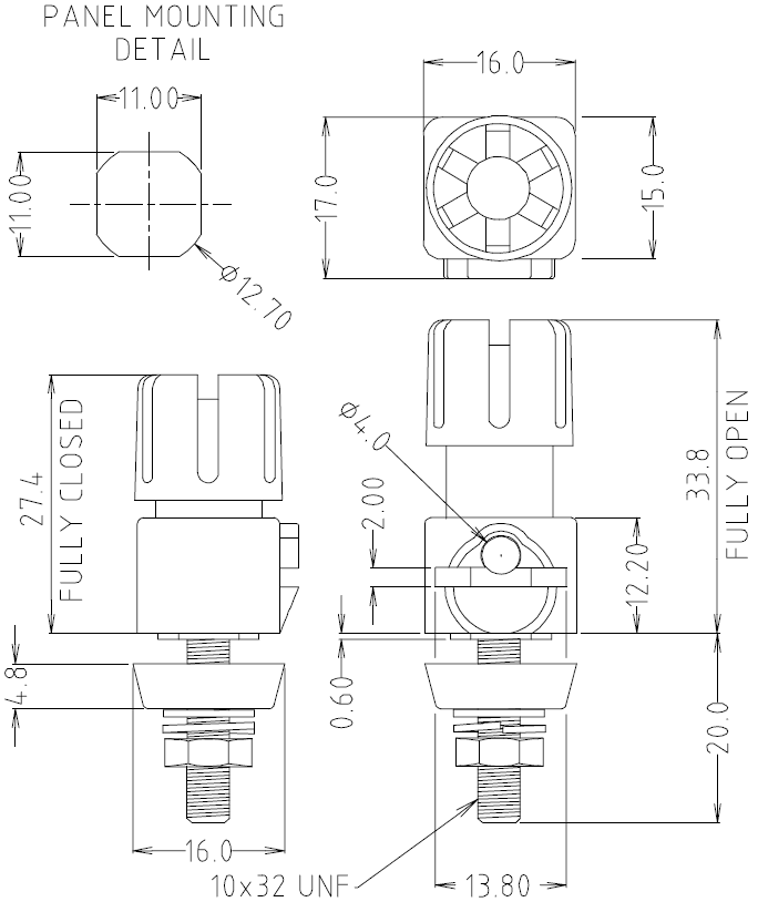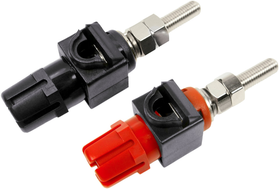 All terminals are supplied with one plain washer, one spring washer and one nut. TP44 has a 10 × 32 UNF thread. TP60 has ¼″ UNF thread. All models can be supplied with either a nickel or gold plated finish and different stud lengths are available. Red and black blanking plugs are for inserting into the 4 mm end-holes to comply with European safety regulations. Clear plastic knobs with colouredcolored idents can be supplied to order, subject to quantity. Especially used on gold-plated versions.