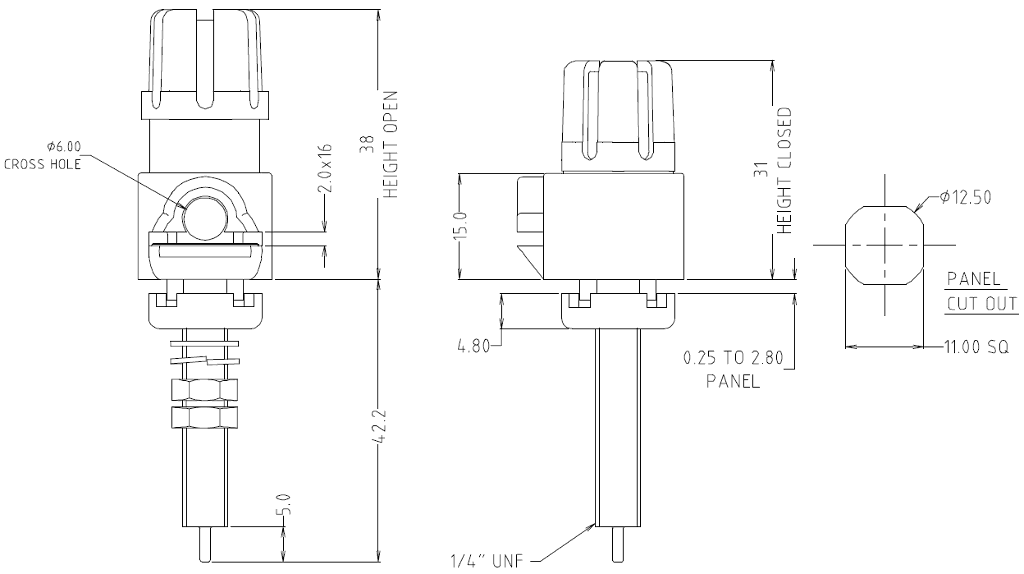 TP60P Heavy-duty, 60 A, PCB mounting. ⌀6 mm cross hole. Long 42.2 mm spindle.