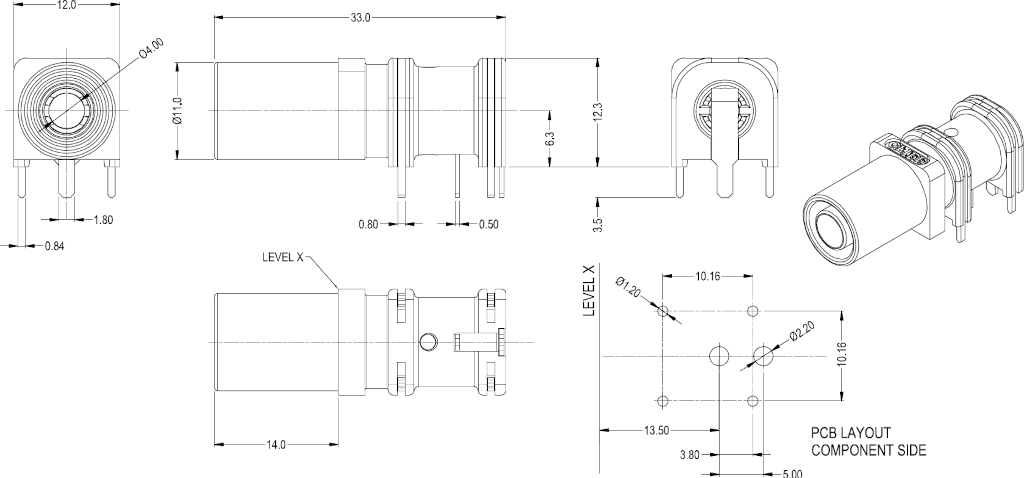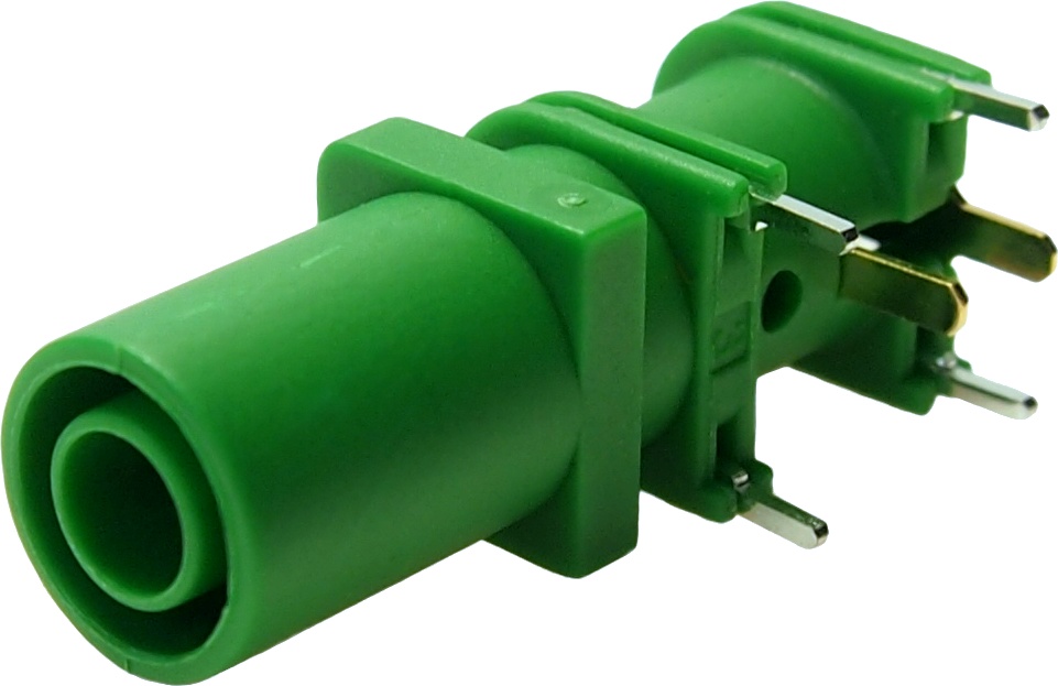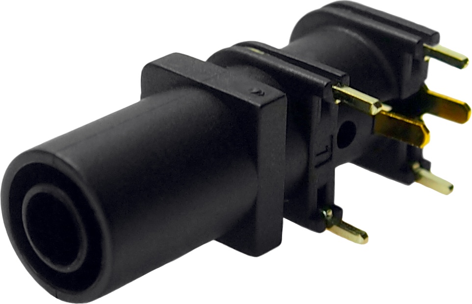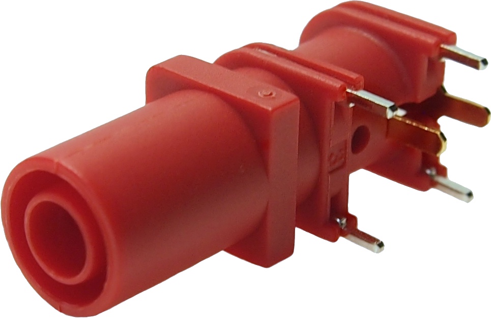 Shrouded, 4 mm socket. 90° PCB mount. Gold-plated. Mates with shrouded or unshrouded 4 mm plugs .