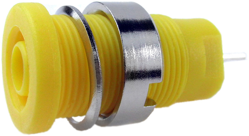Shrouded, 4 mm socket. Gold-plated. Mates with shrouded or unshrouded 4 mm plugs .