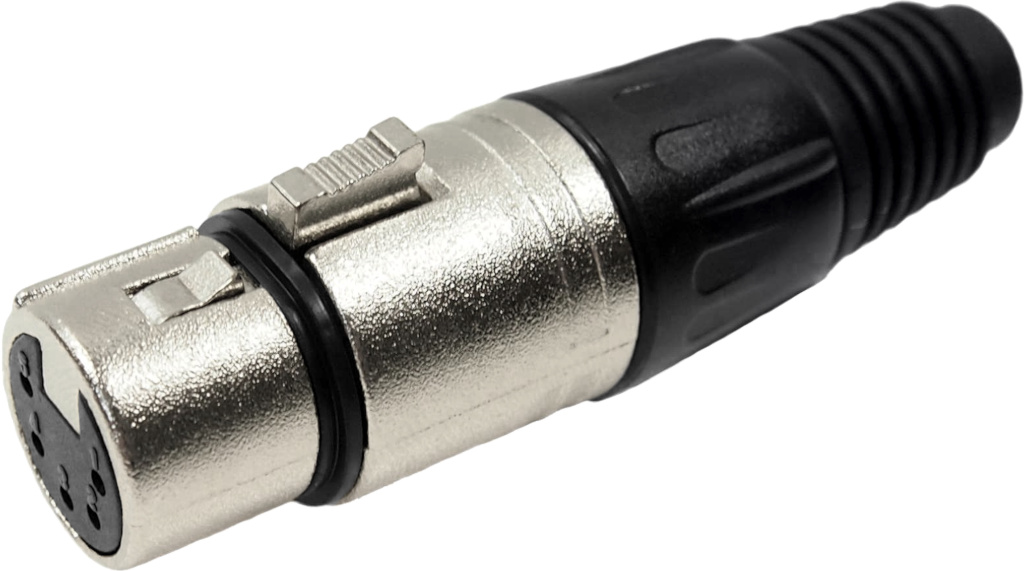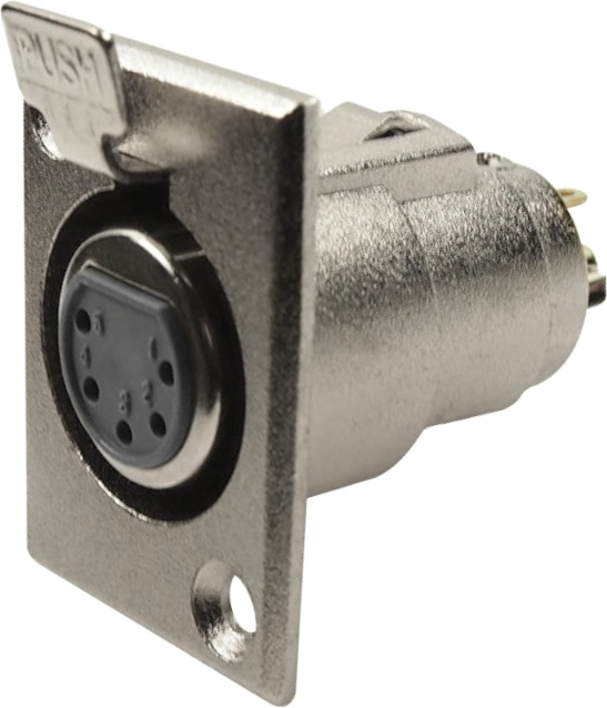 5-pole, black metal, female socket with latch. XLR-format panel cut-out.