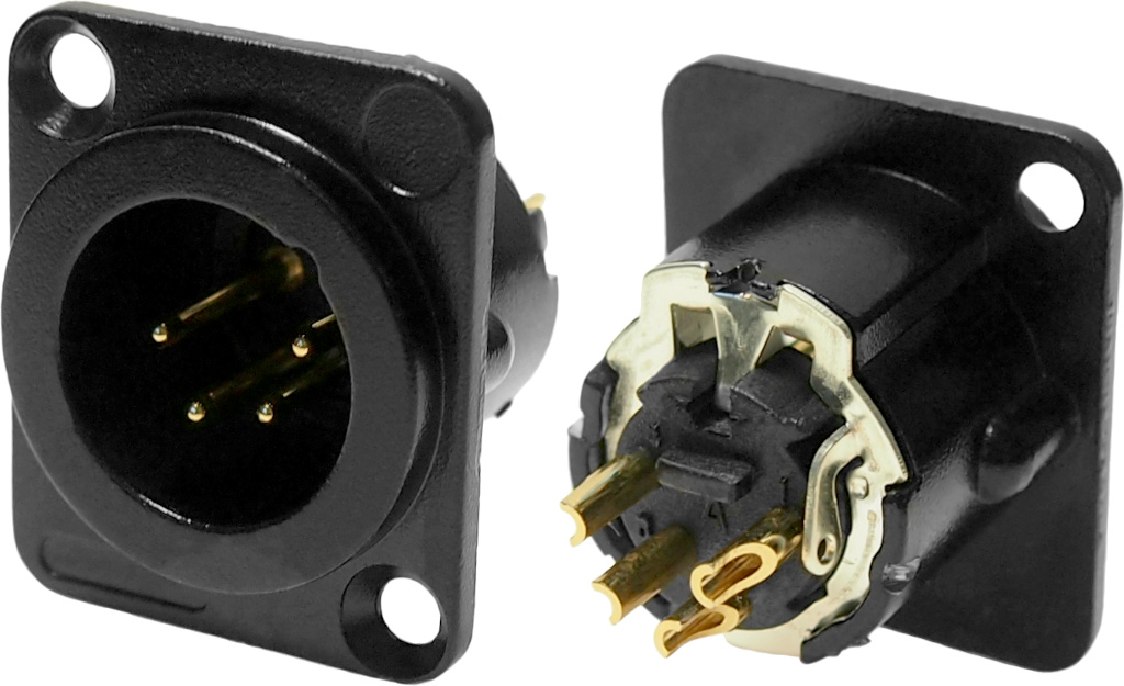 4-pole, black metal, male socket. XLR-format panel cut-out.